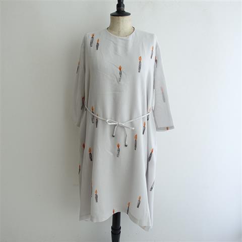 デザイン:mina perhonenのcandle キャンドルプリントウールフレアドレスワンピースです。カラーはライトグレーベースに、ダークグレー・オレンジでキャンドルのプリントの微起毛薄手生地で仕立てられており、裏地が付いております。襟ぐりは光沢のあるくすんだピンクのパイピングが施されており、バック襟元のボタン開閉のプルオーバータイプです。両端の少し長いイレギュラーヘムのフレアなシルエットになっており、両サイドにシームポケット付き、共布の腰ひもが付属されております。