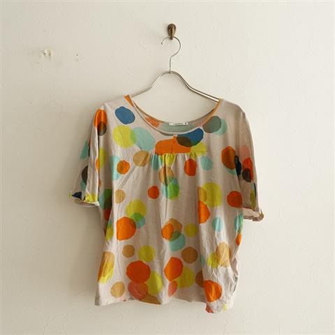 デザイン:mina perhonenのrain star カットソーです。カラーはグレーベージュベースにオレンジ・イエロー・ネイビーブルー・サーモンピンクなどの手描き風プリントで、薄手の天竺ニット地です。フレアスリーブデザインで、胸元にギャザーが施されております。