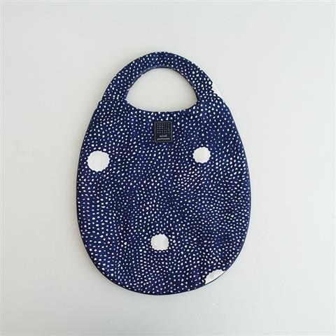 デザイン:mina perhonenのskumエッグバッグです。カラーはネイビー×オフホワイトの総柄で、サイド周りにネイビーの合皮パイピングが施されています。内側は光沢のあるダークネイビーの裏地付きで、素材は表生地が麻54%,綿46%、裏生地がポリエステル100%です。定価11,000円(税込み)の商品です。