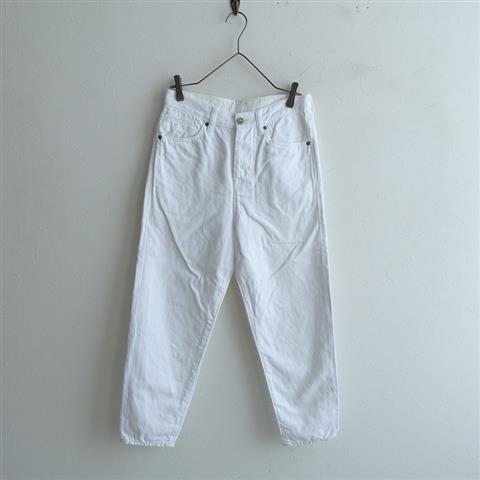 デザイン:mina perhonenのalways テーパードデニムパンツです。カラーはホワイトで、ノンストレッチのセルビッチデニムで仕立てられております。フロント開口部はボタンフライ仕様で、5ポケット、右ヒップにはゴールドのチョウチョのモチーフがあしらわれております。ウエスト裏には「mermaid」のテキスタイル刺繍入り、本体価格は33,000円(税抜き)です。