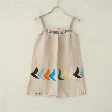 デザイン:mina perhonen「bird」の刺繍使いAラインキャミソールです。カラーはサンドベージュ×ピンク・緑・青・オレンジなどの刺繍です。透け感のある麻ベースの甘い平織り生地を使用。トップ部分はゴムを使ったスモッキング刺繍を配し、フリルと裾のヘムはピコカット仕様。裾にはテキスタイルの刺繍が施されております。肩紐部分のリボンテープはストレッチ性がございます。