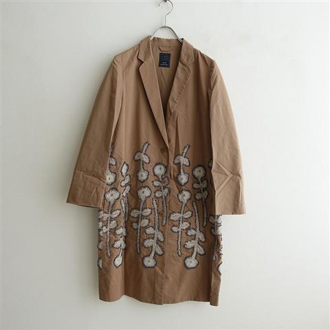 デザイン:2019 new year item、mina perhonenのfrost gardenコートです。カラーはライトブラウンベースに生成り・グレーで大きな花のモチーフが刺繍されており(表記はブラウン)、ほんのり光沢感のある生地であしらわれています。フロントボタンで、両腰辺りと左胸内側にポケットがあり、裏地付きです。テーラードカラーで、定価121,000円(税込み)の商品です。