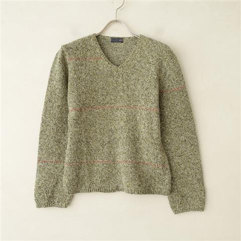 デザイン:minaのline シルクアルパカウール混Vネックニットプルオーバーです。カラーはグリーン系×ホワイトのミックスに、ピンクのステッチでラインが施されております。やや薄手の素材です。