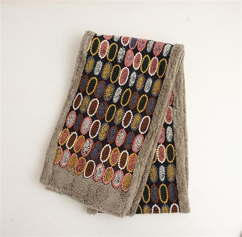 デザイン:mina perhonenのtarte ボア×刺繍ストールです。グレーの厚手のボア素材ベースで、ネイビーのメッシュ地にピンク・イエロー・ブラウン・ホワイト・ブルーグレーのテキスタイル刺繍があしらわれております。