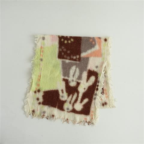 デザイン:mina perhonenのストールです。カラーはアイボリーベースにブラウン・ピンク・グレーなどの総柄で、縁周りはフリンジ仕様です。