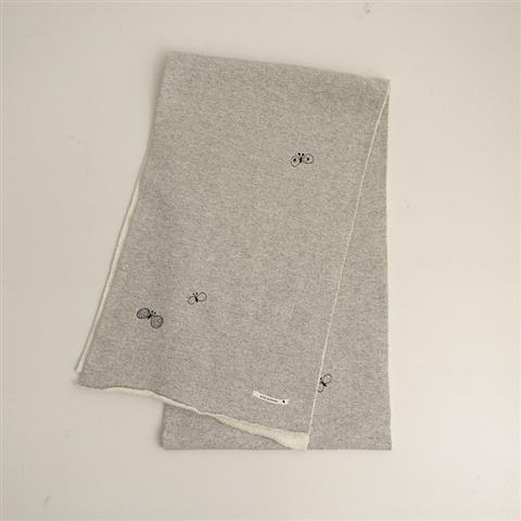 デザイン:mina perhonenの裏起毛刺繍ニットマフラーです。カラーはミックスグレーベースにブラックの蝶刺繍入りで、ストレッチ性のあるニット素材です。裏面はホワイトの起毛素材で、周りは裁ち切り仕上げです。