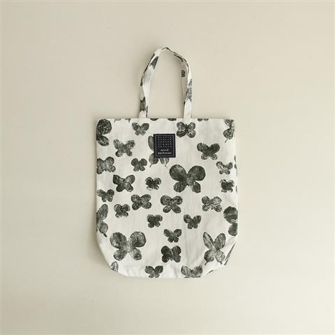 デザイン:mina perhonenのmemoria トーストバッグです。カラーはホワイト×ダークグリーンで、チョウチョの「memoria」テキスタイルプリント地で仕立てられております。内側はライトグレーの別地に切り替えられ、素材は表地が綿100%、裏地がポリエステル100%です。
