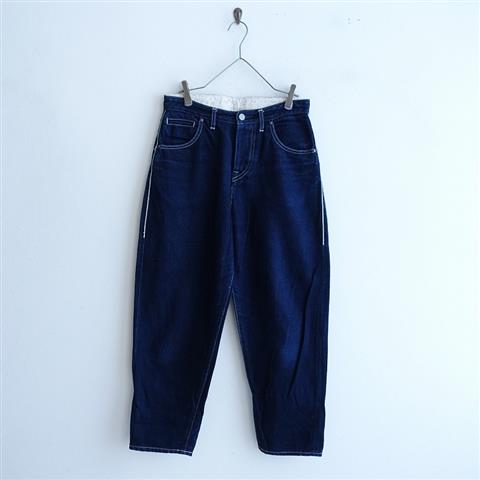 カラーはインディゴブルーです。コットンリネンのセルビッチデニム地で仕立てられ、開口部はボタンフライ仕様です。コインポケットを含む5ポケット付きで、ウエスト裏側やポケット袋布は「mermaid」のテキスタイル刺繍が施されております。