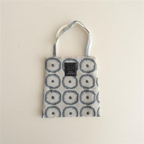デザイン:mina perhonenのmemory dreamミニバッグです。カラーはライトグレーベースにブルーグレー・ダークグレーでお花のテキスタイル刺繍が施された生地とオフホワイトベースにグレーのテキスタイル刺繍が施された生地が切り替えられており、内側は光沢のある淡いピンクの裏地付きです。