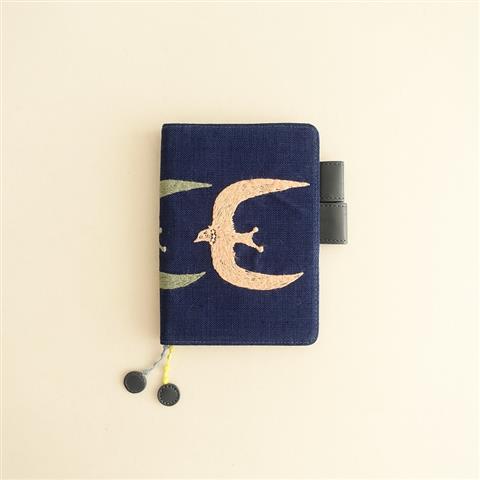 デザイン:mina perhonen×HOBONICHIのgo! A6サイズ オリジナル手帳カバーです。カラーはネイビーベースに、イエロー・ライトグリーン・サーモンピンクで一列に並んだ鳥の刺繍があしらわれております。内側はネイビーの布帛×合皮に切り替えられ、カードポケット×4,スマイルポケット×1,大ポケット×2,チケットポケット×1,しおり×2,バタフライストッパー付きです。