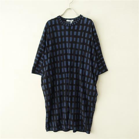 デザイン:mina perhonenのsora checkカットソーワンピースです。カラーは黒×ネイビーで、大きさの違うチェック柄が切り替えられたデザインです。ゆったりしたドルマンタイプで、両腰辺りにポケットがございます。