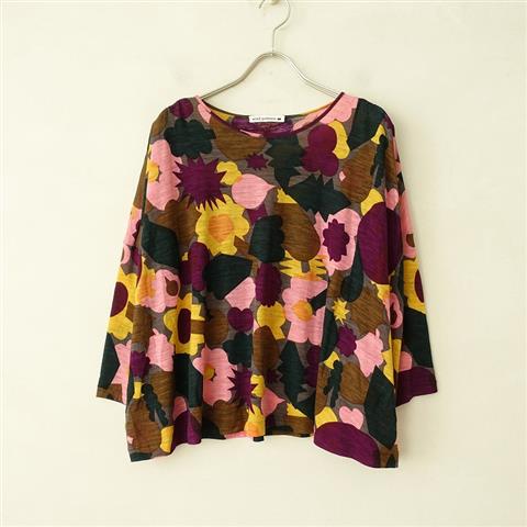 デザイン:mina perhonenのflower basket ウールプリントカットソーです。カラーはダークグレーベースに、パープル・ブラウン・ピンク・イエロー・ダークグリーン・オレンジのテキスタイルプリントの薄手ウール地で仕立てられております。袖丈は八分くらい、両肩にギャザー入り、身幅の広いシルエットになっております。