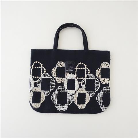 デザイン:mina perhonenのveronicaレッスンバッグです。カラーはダークネイビーベースにオフホワイト・ライトベージュでお花のテキスタイル刺繍があしらわれており、内側はダークネイビーの裏地&オープンポケットが1つ付いています。素材は表生地が綿80%,ポリエステル20%、刺繍部分と裏生地が綿100%です。