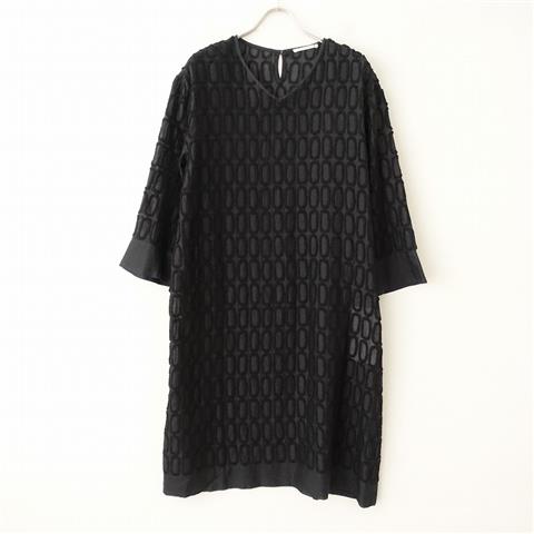 デザイン:mina perhonenのgrass window ワンピースです。カラーはブラックです。透け感ある薄手素材で、全体にパイル刺繍が施されております。緩やかなVネックで、バックネックにループボタン&ドロップホール付きのプルオーバータイプで着脱できます。ポケット・裏地は付いておりません。