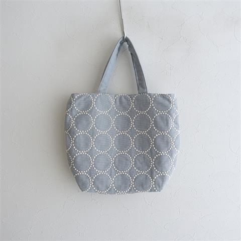 カラーはグレーブルーベースに「tambourine」のテキスタイル刺繍が施されたデザインです。開口部はオープンで、内側はブラウンの別地に切り替えられており、同生地のフラップとオープンポケットが2つ付いています。サイドはアイボリーの合皮のパイピングが施されており、マチ付きのやや小ぶりなバッグです。