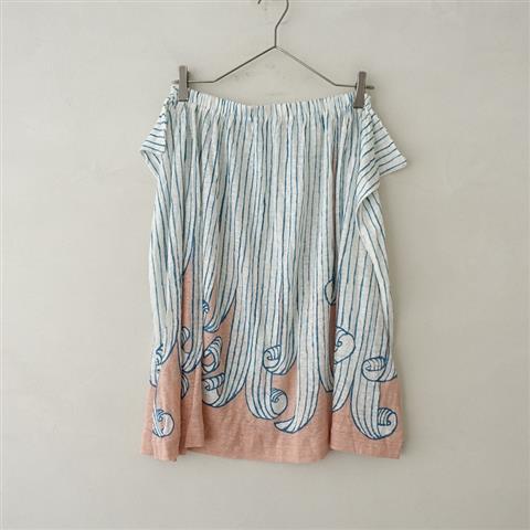 デザイン:mina perhonenのswing リネンスカートです。カラーはサーモンピンク・ライトネイビー・オフホワイト(表記pink)で、透け感のある薄手素材です。ウエスト総ゴムで、ポケット&裏地はございません。
