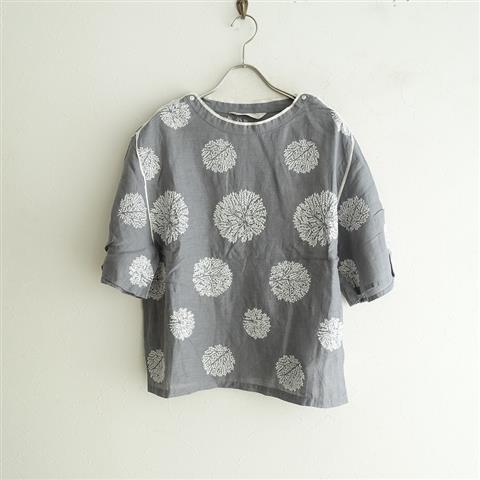 カラーはグレーです。「forest dot」のテキスタイル刺繍があしらわれた、薄手のリネン地で仕立てられ、衿ぐり両サイドにボタン付きのプルオーバータイプです。衿ぐりから肩、袖ぐりに裁ち切りのパイピングが施されたデザインです。