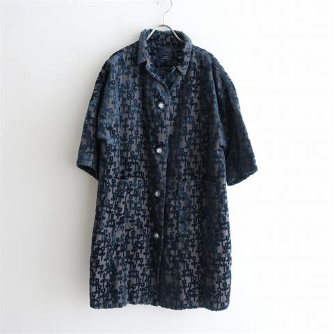 デザイン:mina perhonen「chorus」のリネンベルベットジャカードドロップショルダーコートです。カラーはモカグレー地×モスグリーンです。麻生地をベースにした、ベルベットジャカード生地を使用。テキスタイル「chorus」野に咲く花たちが皆で合唱しているような景色が表現されています。裏地付きで仕立てられています。肩が落ちたドロップショルダーで、身頃もゆったり、前立てのオリジナルのボタンがポイントです。前両腰にはパッチポケットがございます。