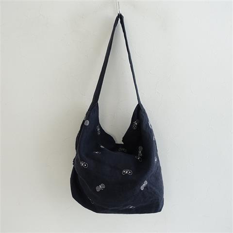 デザイン:mina perhonenのchouchoショルダーバッグ大です。カラーはチャコールグレーベースにアイボリーのテキスタイル刺繍が施されており、開口部はファスナー開閉です。内側はチャコールグレーの裏地とファスナーポケットが1つ付いており、ショルダーストラップ以外にも手から提げることのできる持ち手の付いた2way仕様です。身に着けると自然に体に沿うようサイドにタックが施されており、素材は表生地が麻100%、刺繍部分と裏生地が綿100%で、定価22,000円(税込み)の商品です。