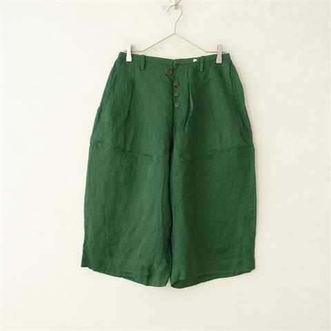 カラーはグリーンです。少し光沢感があり、微起毛がかった薄手のリネン生地で仕立てられ、前立てはボタンです。両腰にポケットがあり、ウエストに蝶々のワンポイント刺繍入りです。