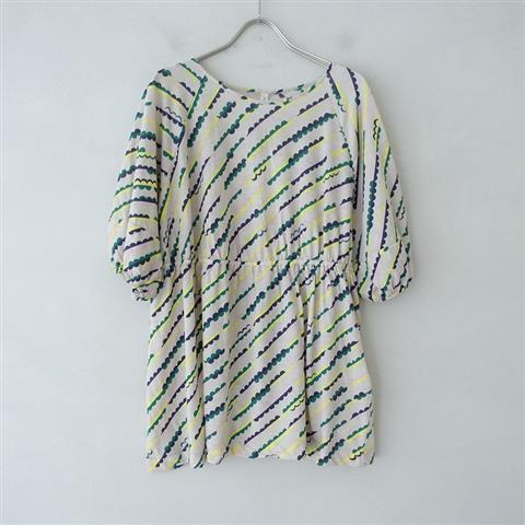 カラーはライトグレーベージュ(表記カラー:light gray)です。「lumpy」テキスタイルプリントがあしらわれた薄手の天竺ニットで仕立てられ、プルオーバータイプです。袖口やウエストにゴム入りで、本体価格28,000円+税の商品です。