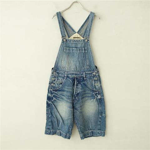 カラーはインディゴブルー(表記:blue)です。ユーズドダメージ加工の施されたデニム地で仕立てられ、両腰のボタンで着脱でき、肩ひもは長さ調整可能です。両腰&両ヒップにポケット、胸元にポケット付きです。