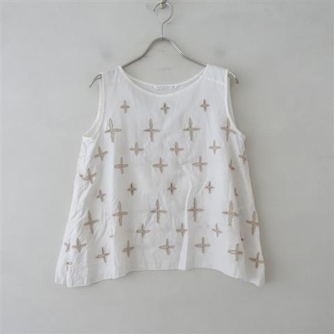 デザイン:mina perhonenのwild star タンクトップです。カラーはオフホワイト、全体にベージュのカットワーク刺繍のあしらわれたやや透け感のある薄手素材で、プルオーバータイプです。