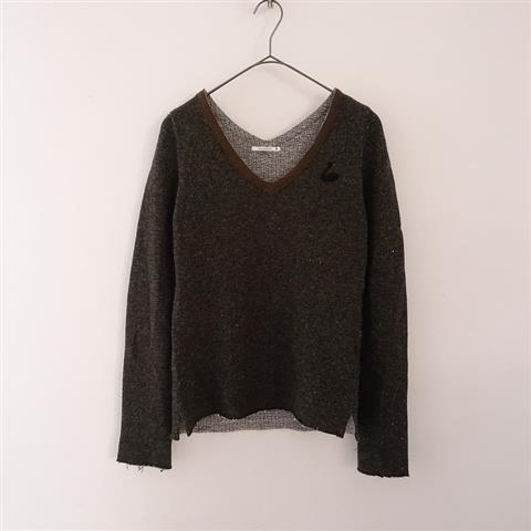 カラーはネップ入りのカーキ×ブラックのヘリンボーンです。裏毛の少し起毛がかった素材で仕立てられ、Vネックのプルオーバータイプです。ネックラインにはブラウンの裁ち切りパイピングがあしらわれ、袖口や裾も裁ち切り仕様です。裾サイドにスリット入りで、左胸の刺繍がアクセントです。