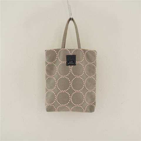 デザイン:mina perhonenのtambourine toast bagトーストバッグです。カラーはグレー×ベージュの織地ベースにライトグレーベージュのテキスタイル刺繍入りで、内側は光沢のあるベージュの裏地付きです。素材は表生地と刺繍部分上糸が綿100%、刺繍部分下糸と裏生地がポリエステル100%です。