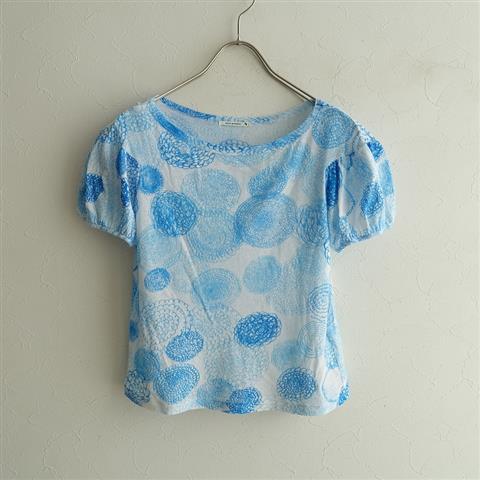 デザイン:mina perhonenのrain chukka コットンカットソーです。カラーはライトブルー・ブルーなどで、プリント柄が全体にあしらわれた薄手素材です。プルオーバータイプで、デザインバルーンスリーブで袖口にパイピングが施されております。