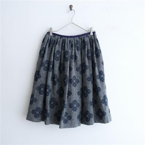 デザイン:mina perhonenのhana beads ウールタックスカートです。カラーはグレーでウールガーゼのような微起毛地で仕立てられており、ネイビーの刺繍があしらわれております。ウエストはパープルのテープ&ブランケットステッチが施されており、タック入りでふんわりとしたシルエットになっております。左腰のファスナー開閉で着脱でき、裏地付きです。