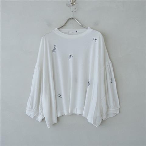 デザイン:2021年AWコレクションmina perhonenのchoucho カシミヤ混刺繍ワイドカットソーです。カラーはオフホワイトで、柔らかな手触りのカットソー地で仕立てられており、ダークネイビーでチョウチョの刺繍があしらわれております。かなり身幅の広いドルマンデザインで、定価25,300円(税込み)の商品です。