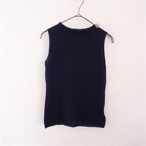 カラーはネイビーです。柔らかなやや薄手のシルクカシミヤのニットで仕立てられ、衿ぐりはスカラップデザインのハニカムモチーフが付いたデザインです。プルオーバータイプです。