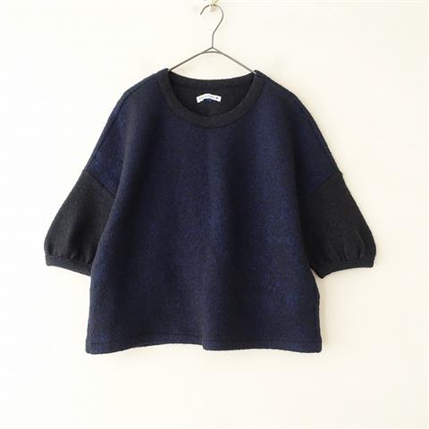 カラーはネイビーブルーです。起毛したループヤーンの素材で仕立てられ、プルオーバータイプです。ゆったりとした身幅のドロップショルダーで、袖口にギャザー入りのパフスリーブデザインです。背上部に蝶のワンポイント刺繍入りです。