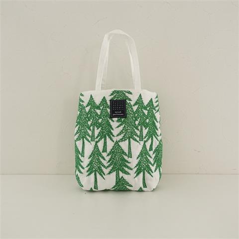 デザイン:mina perhonenのland theaterランチトートバッグです。カラーはホワイトベースにグリーンで、深い森に生い茂る木々を描いたテキスタイル刺繍があしらわれており、内側は光沢のあるホワイトの裏地が付いています。素材は表生地が麻100%、刺繍部分が綿100%、裏生地がポリエステル100%です。