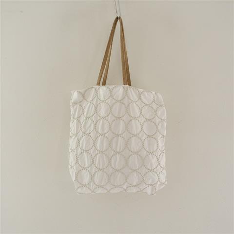 デザイン:mina perhonenのtambourine巾着バッグです。カラーはオフホワイトベースにアイボリーのテキスタイル刺繍があしらわれており、開口部はスナップボタン&巾着仕様です。素材は本体・刺繍部分が綿100%、持ち手が人工皮革です。