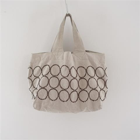 デザイン:mina perhonenのtambourineパニーニバッグです。カラーはナチュラルベージュベースにダークブラウンのテキスタイル刺繍があしらわれており、内側はオレンジの裏地&イエローの蝶々のワンポイント刺繍が施された共布の被せとオープンポケットが2つ付いています。素材は表生地が麻100%、裏生地と刺繍糸が綿100%です。