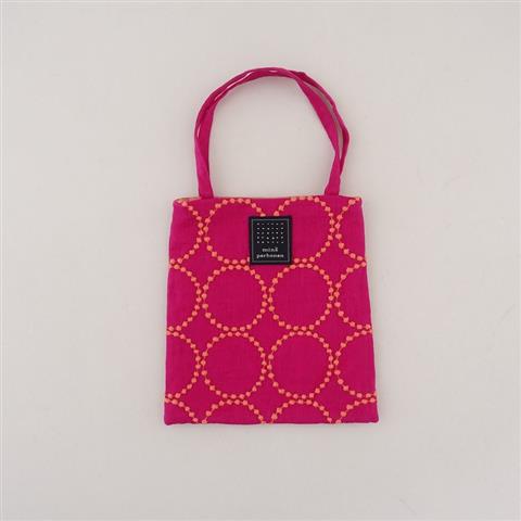 デザイン:mina perhonenのtambourine ミニバッグです。カラーは紫がかった濃いピンクベースにくすみオレンジの刺繍入りで、裏地は光沢のあるくすみオレンジです。開口部はオープンで、ポケットは付いておりません。素材は、表生地が麻100%・刺繍部分が綿100%・裏生地がポリエステル100%です。