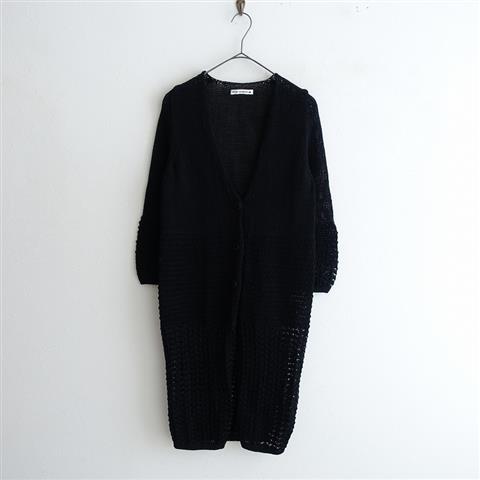 デザイン:mina perhonenのsunny sandy ロングニットカーディガンです。カラーはブラックで、所々に透かし編みが施された様々な編み柄の綿ニット地です。フロントボタンで着脱でき、袖口・裾はリブ編みです。定価70,400円の商品です。