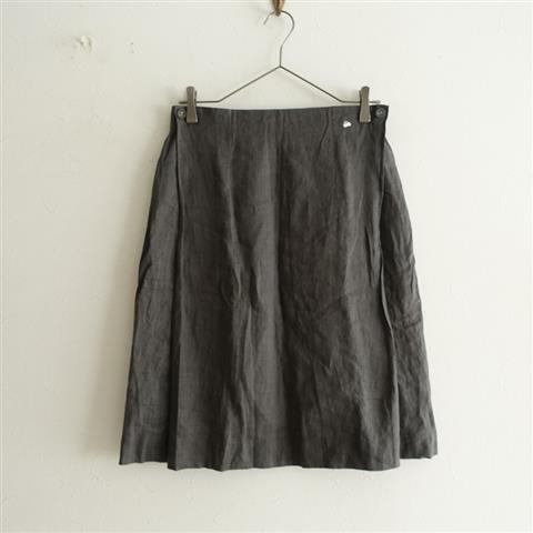 デザイン:mina perhonenのNordic サイドタックスカートです。カラーはグレーで、薄手の麻素材です。フロント両サイドのタックがウエストでボタン留めされたデザインで、フロントウエスト左寄りにホワイトの蝶刺繍入りです。バックウエストにゴム入りで、裏地付き、ポケットは付いておりません。