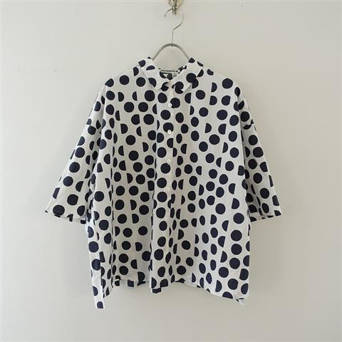 デザイン:2022年SSコレクション、mina perhonenのpalkeetブラウスです。カラーはオフホワイト×ダークネイビーのドット柄(表記はホワイト)で、ほんのり光沢感のある生地であしらわれており、フロントボタンです。裾は若干後ろ下がりで、両サイドに8cmほどのスリットが入っており、ゆったりしたシルエットです。定価39,600円(税込み)の商品です。