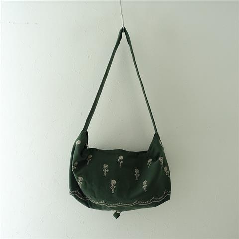 デザイン:mina perhonenのetudeショルダーバッグ小です。カラーはくすみグリーン系ベースにベージュのテキスタイル刺繍があしらわれており、開口部はファスナーです。内側はベージュの裏地とファスナーポケットが1つ付いており、ショルダーストラップ以外にも手から提げることのできる持ち手の付いた2way仕様です。素材は表生地・刺繍部分・裏生地全て綿100%で、定価23,100円(税込み)の商品です。