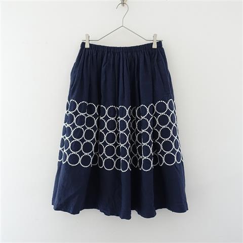 デザイン:mina perhonenの「tambourine」コットンリネンエンブロイダリーギャザースカートです。カラーはネイビー×ホワイトです。綿麻の程よく厚みのある柔らかな生地に、テキスタイル「tambourine」の刺繍があしらわれております。滑りの良い裏地付きで仕立てられています。ウエストが総ゴム入りのギャザースカートです。前両腰に片玉縁ポケットがございます。定価52,800円(税込)の商品です。