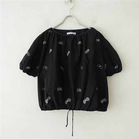 デザイン:2020年春夏コレクション mina perhonenの「choucho」半袖ブラウスです。カラーはブラック×サックスブルーです。ハリのある高密度に織られたコットン生地に、テキスタイル「choucho」の刺繍が施されております。透け感はございません。ネックラインはパイピングコード仕様のギャザー入り、袖口はゴム入りでギャザーを配したパフスリーブです。裾は緩くゴムを通し、ドローストリングで調節が可能です。ポケットはございません。定価は35,200円(税込)の商品です。