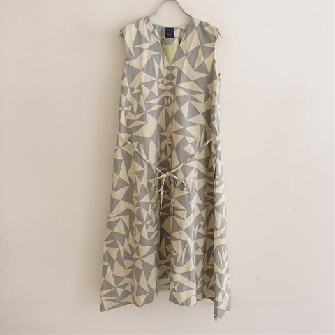デザイン:mina perhonenのperhonen puzzle コットンリネンノースリーブワンピースです。カラーはグレー×ライトアイボリーで、テキスタイルプリントが施されたやや薄手素材です。プルオーバータイプで、左右ウエストにベルトループがあり共布のベルト紐が付属しております。バックネックにギャザーと左右ウエストにシームポケットがあしらわれており、イエロー系の総裏地付きです。定価61600円の商品です。
