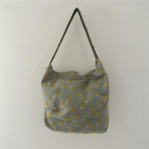 デザイン:mina perhonenのskipショルダーバッグ大です。カラーはグリーングレーベースにマスタード・ライトベージュの立体的なお花の刺繍があしらわれており、ショルダーストラップ裏と持ち手には別珍生地が使用されています。開口部はファスナーで、内側はベージュの裏地とファスナーポケットが1つ付いており、ショルダーストラップ以外にも手から提げることのできる持ち手の付いた2way仕様です。身に着けると自然に体に沿うようサイドにタックが施されており、素材は表生地と裏生地が綿100%、刺繍部分が綿65%,アクリル20%です。