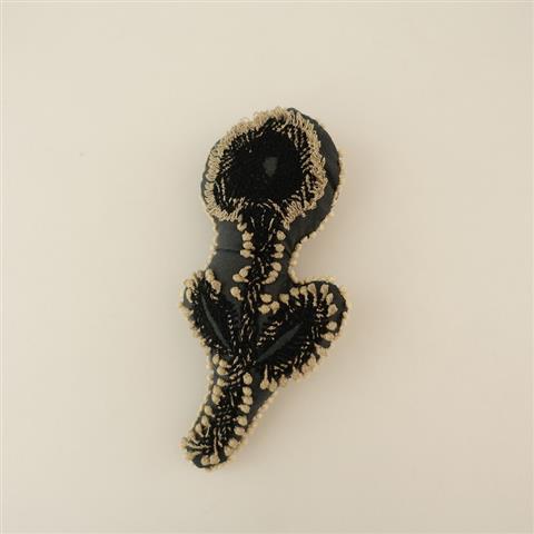デザイン:mina perhonenのfrost gardenブローチです。カラーはチャコールグレーベースに黒・ベージュでお花のテキスタイル刺繍があしらわれており、中綿入りのふっくらとしたお品です。