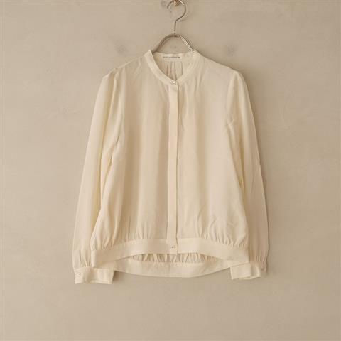 デザイン:mina perhonenの「haze」シルクブラウスです。カラーはクリームです。シルクのシボヲ配したジョーゼット生地を使用。透け感がございます。バンドカラーに、比翼ボタン開きのブラウスで、袖口は1つボタン留めです。背上部にはタックプリーツ、袖口と裾には切替えギャザーを配し、後ろ裾が少し長めで、ふわっと丸みのあるシルエットに仕立てられています。ポケットはございません。定価49,500円(税込)の商品です。
