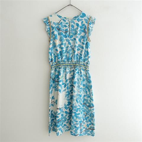 カラーはホワイト、ライトブルー、オレンジ、シルバーラメなどです。リネン特有の張りのある生地で仕立てられ、「nap」のテキスタイルプリントが施されています。フロントトップに1つボタン付きで、ボタン下はスリットのように開いており、袖にはフリルのグログランリボンやピコカットのフレンチスリーブ付きです。ウエストはスモッキング刺繍の施されたゴムシャーリングで、裏地付きのアイテムです。