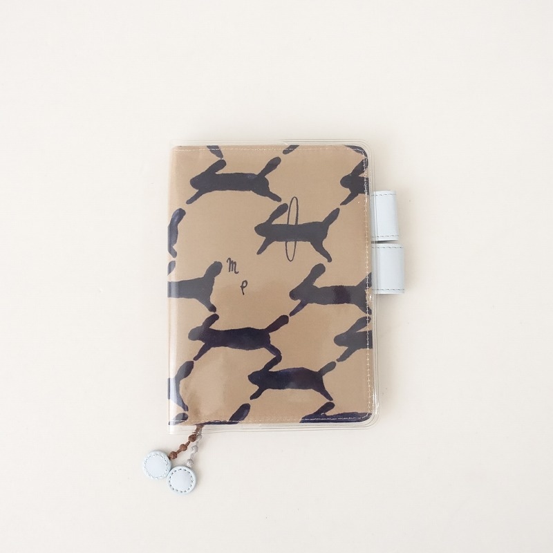デザイン:mina perhonen×HOBONICHIのrun run run 手帳カバーです。カラーはブラウンベースにダークネイビーで、水彩画のようなウサギのプリントが施されたテキスタイルで作られたカバーです。内側はライトブルーの合皮が使われており、フリーポケットが3つ、カード入れが5つ、栞が2本、ペンホルダーが1つございます。クリアカバー付きで、外側にファスナーポケットが1つございます。